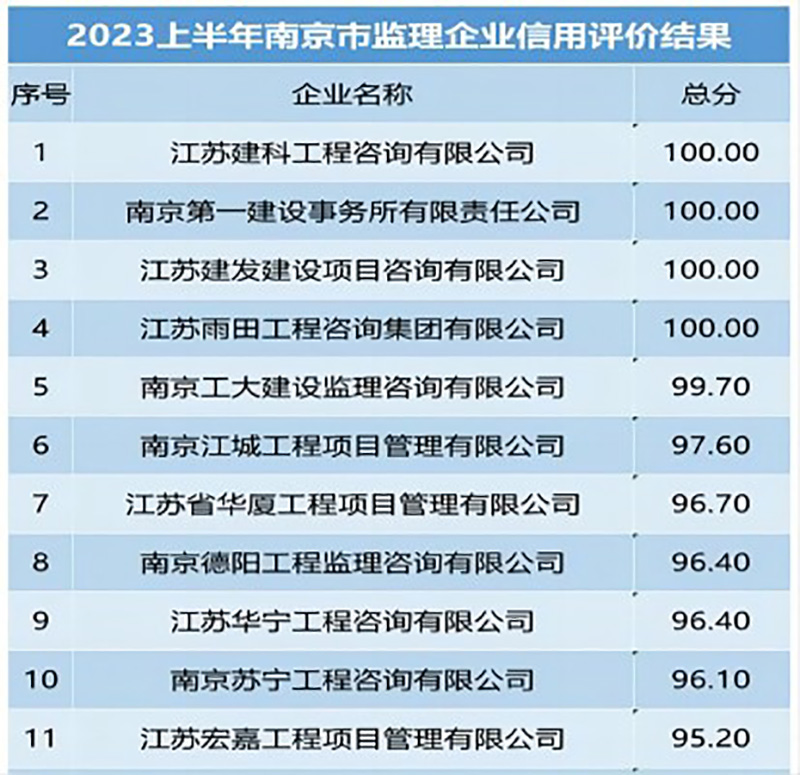 喜訊!宏嘉公司在2023年上半年南京市建設(shè)工程監(jiān)理企業(yè)信用評價(jià)評比中取得全市第11名佳績